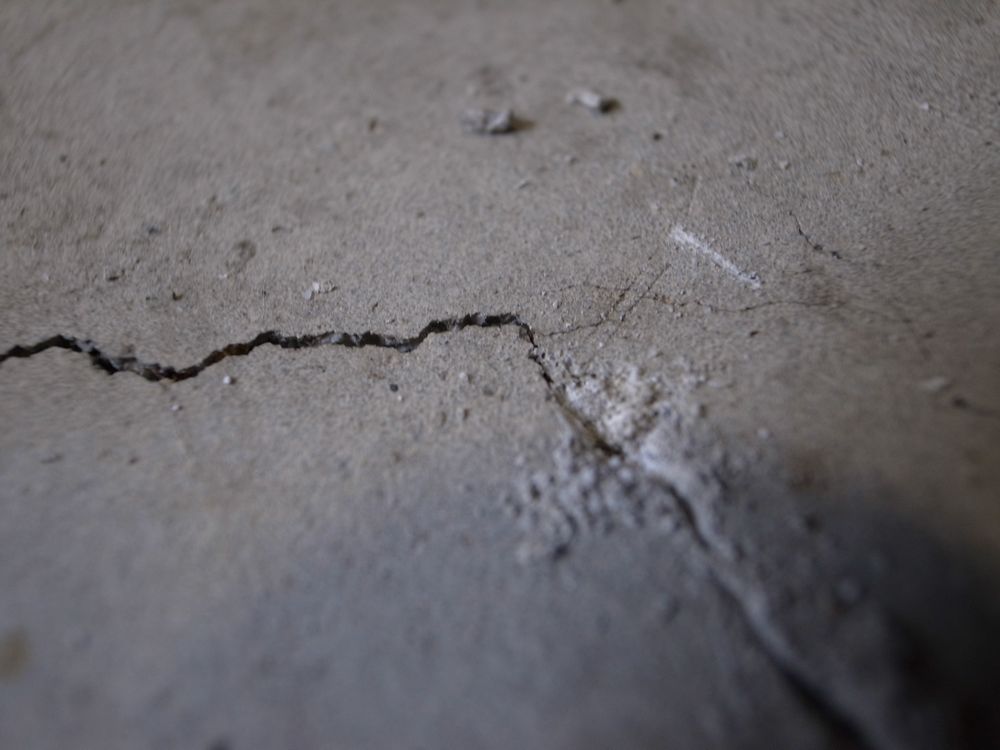 別の日に洗浄し、油分を取り除いたフロアの下準備の仕上げは、ひび割れの補修。