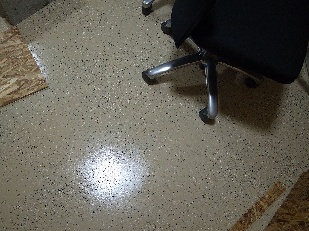 チップは手掴みで適当に撒くだけですが、乾かないうちに施工しないといけないので、フロアを6分割して作業を進めました。