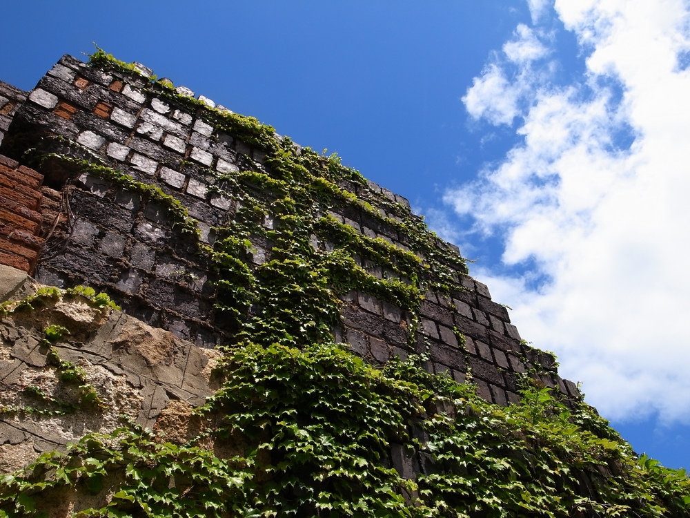 話を戻して、近代建築であるチケットセンターに続く西洋庭園風の広場、その行き止まりの鉄格子から奥が精錬所跡です。