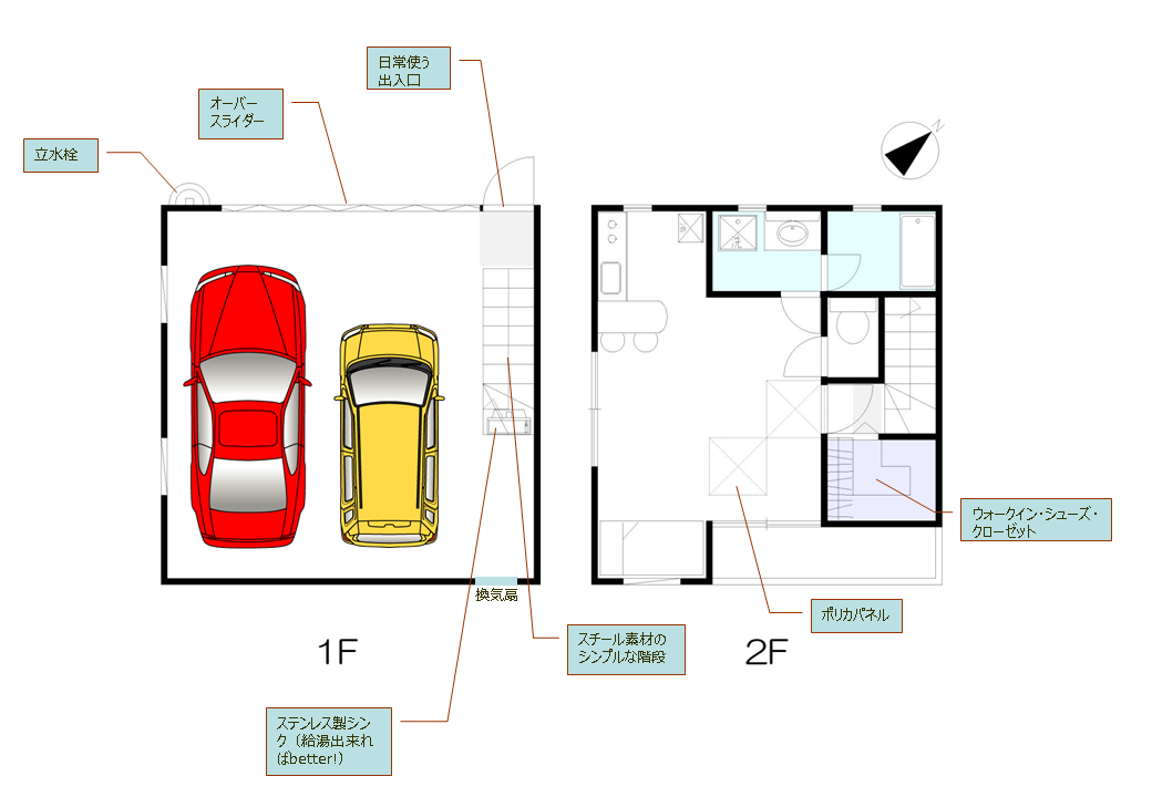 本当は、ガレージ部はピットや排気システム、コンプレッサー埋め込みスペースに天井吊り下げリールがあれば作業も捗るでしょうし、居住部にもロフトやパントリー等の収納スペースが欲しいものですが、コスト面で厳しいですね。