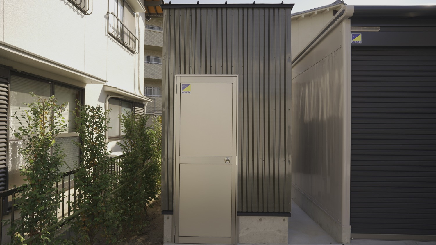 仕様は全戸電動シャッターに照明・コンセント・換気扇・ALSOKセキュリティを標準装備付き。敷地入口には電動チェーンゲートを備え、防犯カメラもALSOK製。