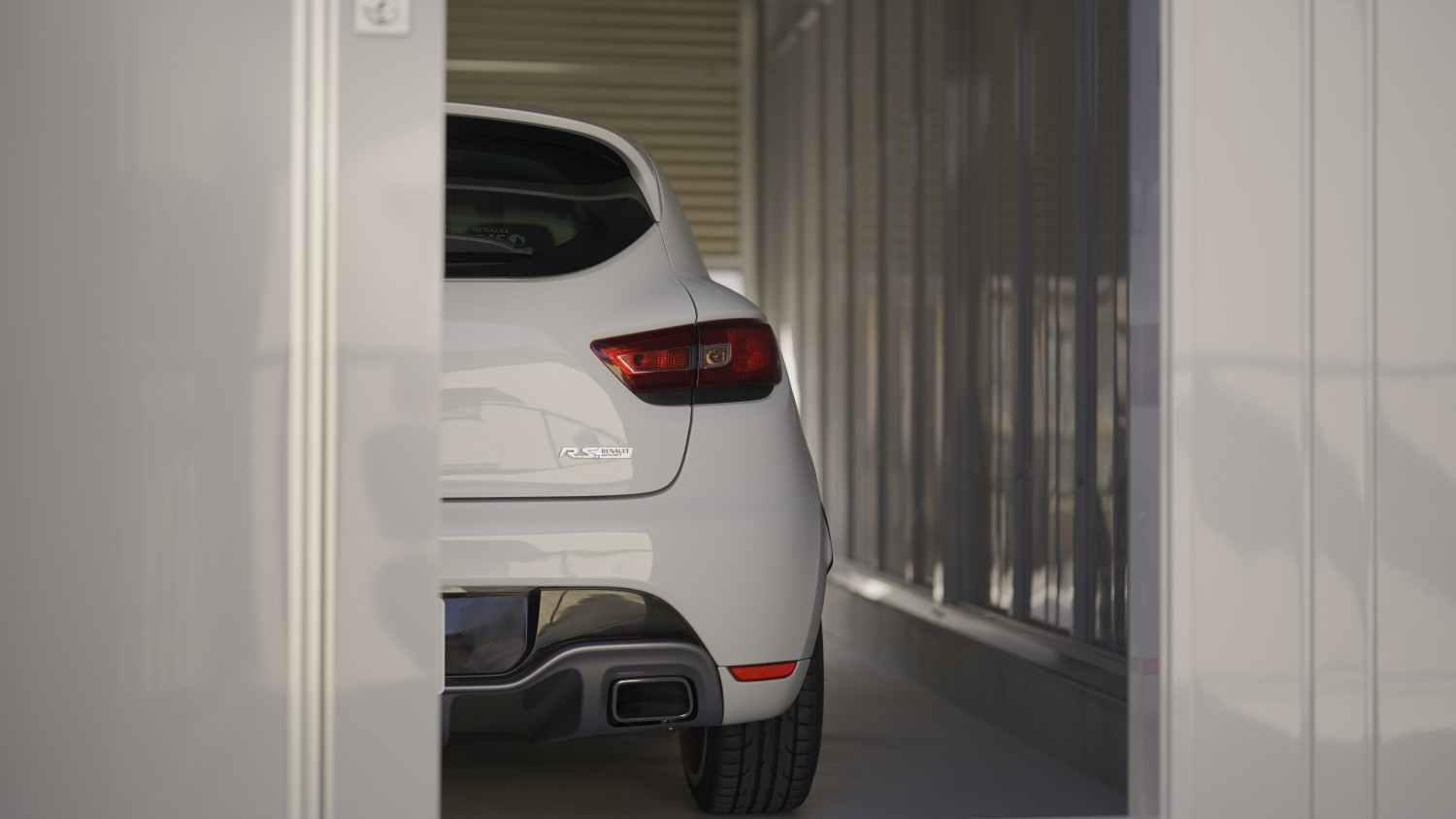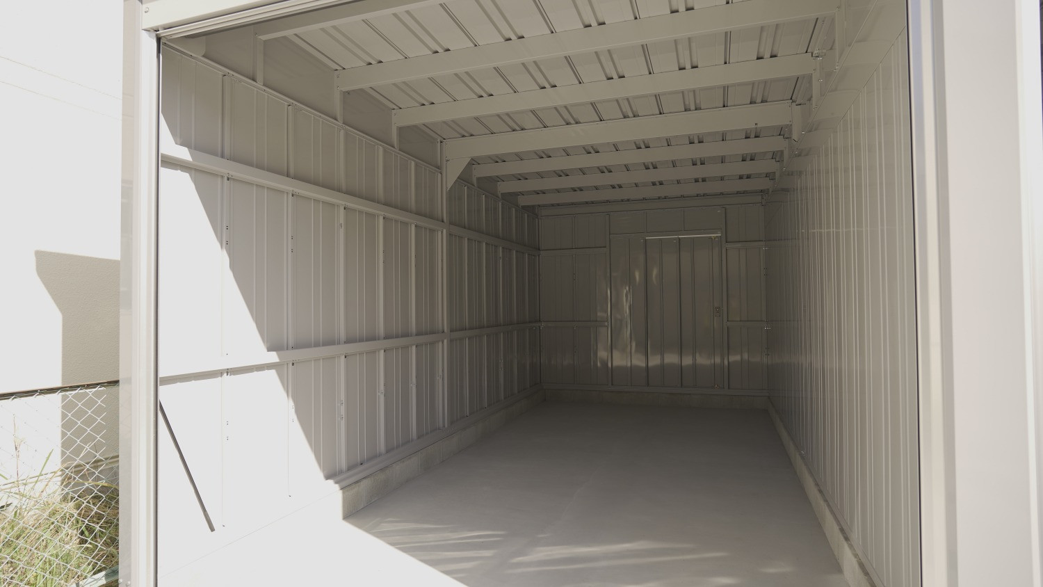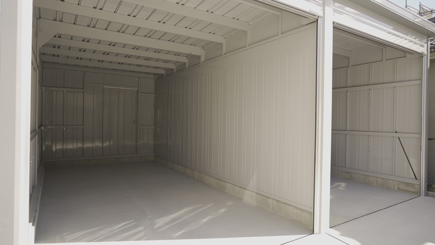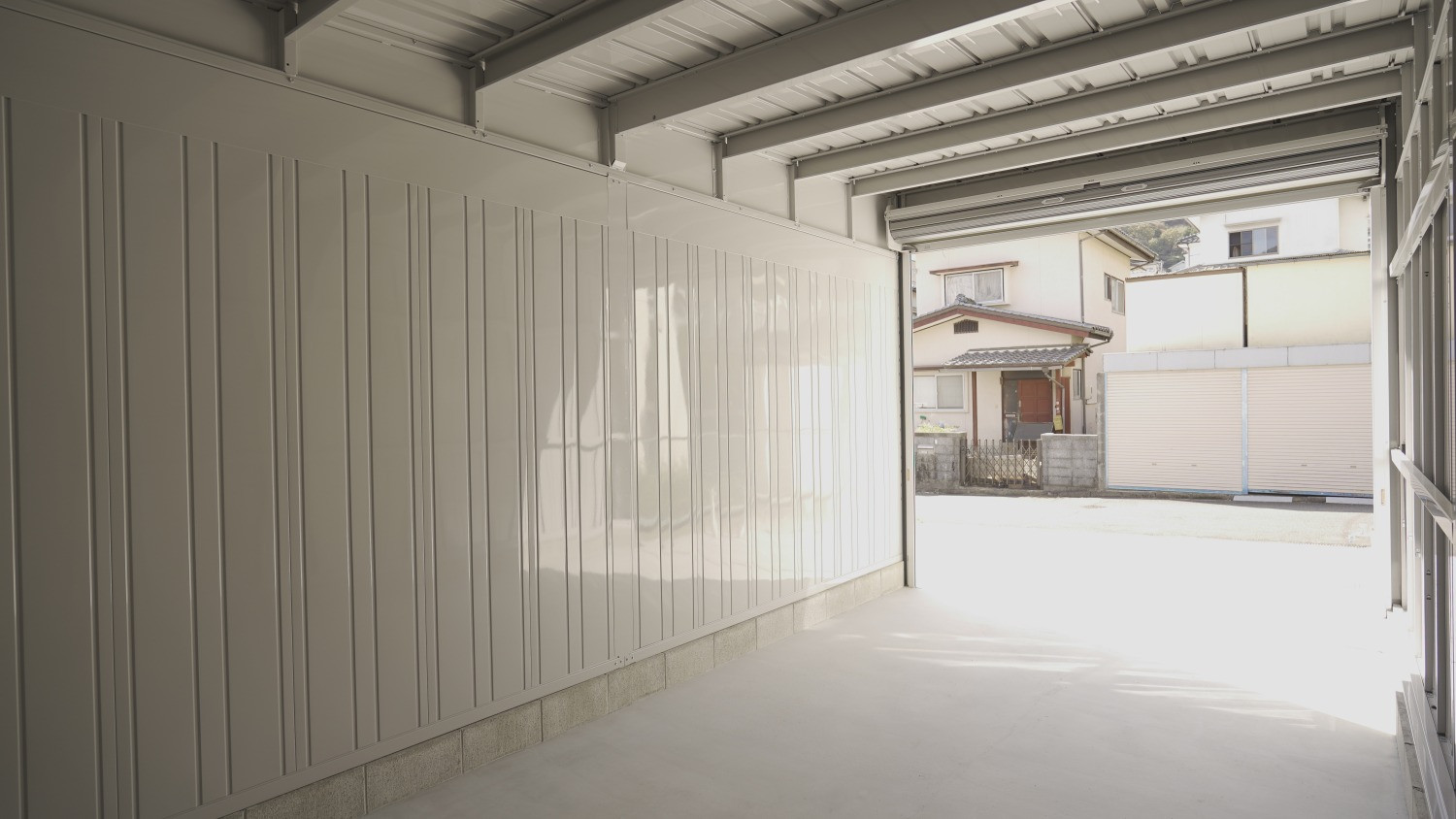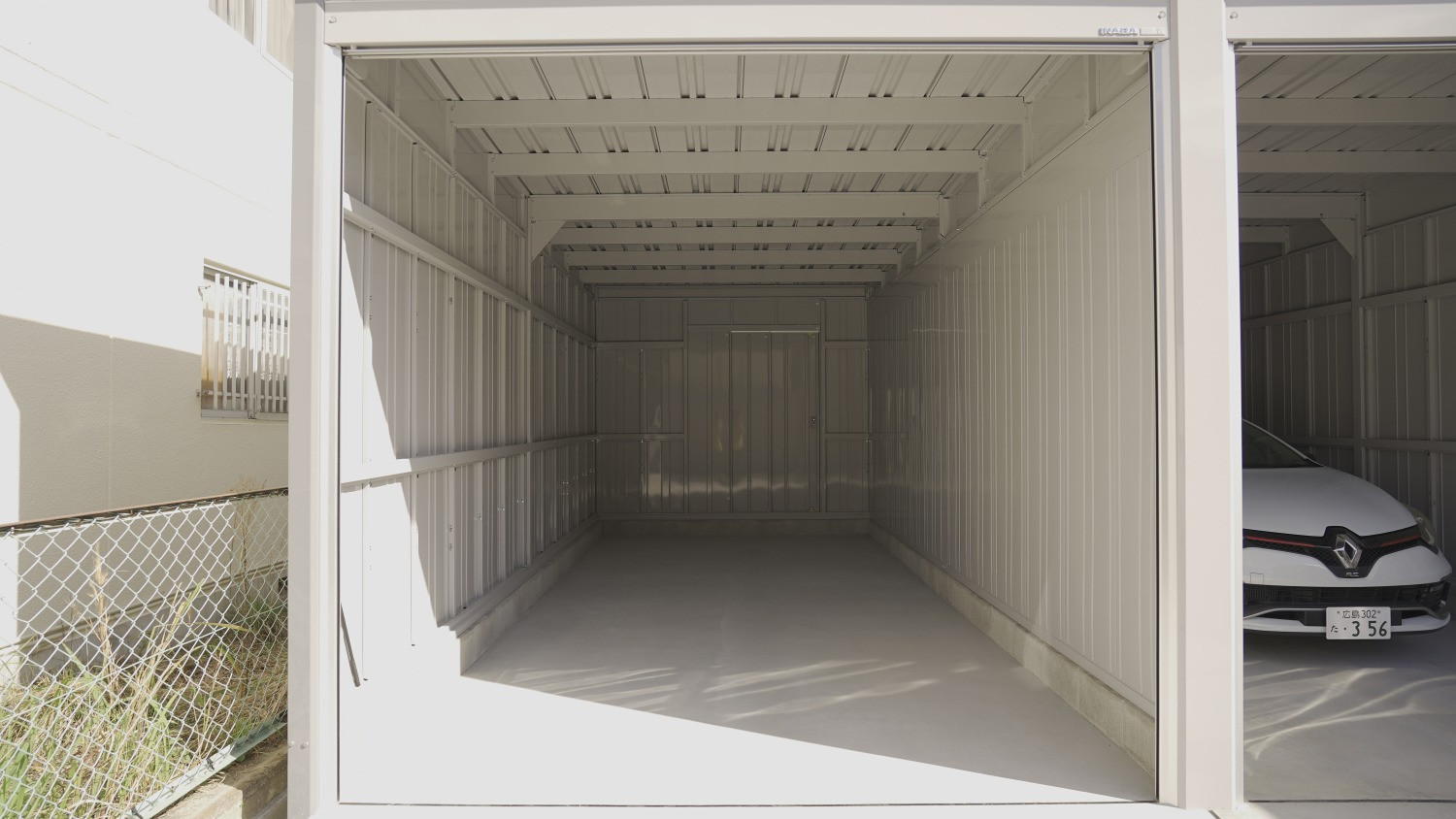 Webコメント 間口3,130mm×奥行6,275mm(開口間口2,850mm×開口高2,630mm)のシャッターガレージに、シャッター前面専用駐車場とガレージ裏の専用物置が1セットとなった物件。