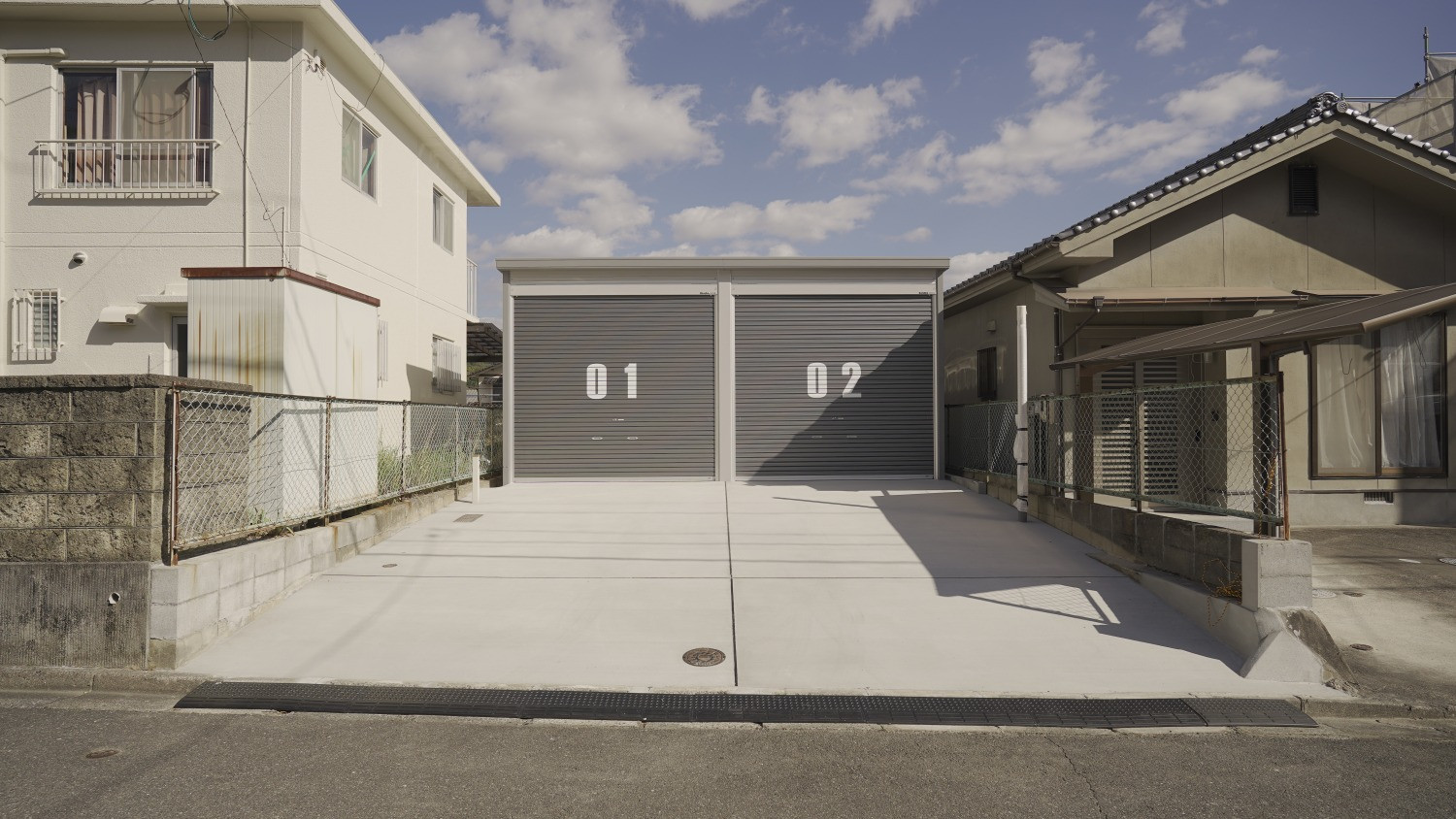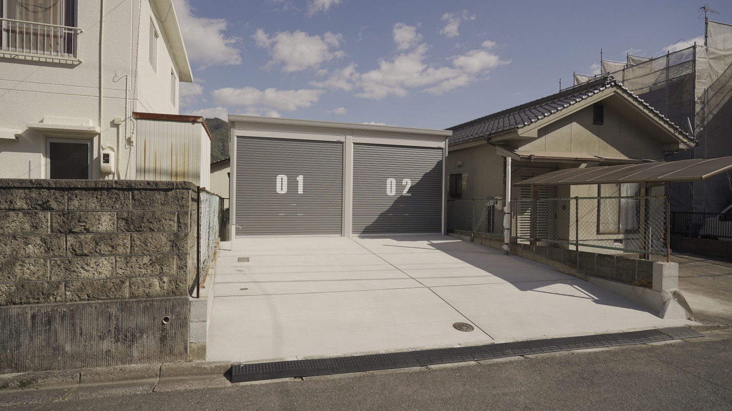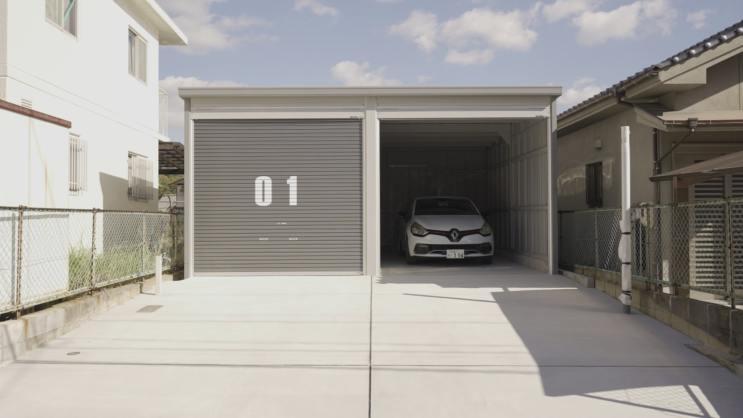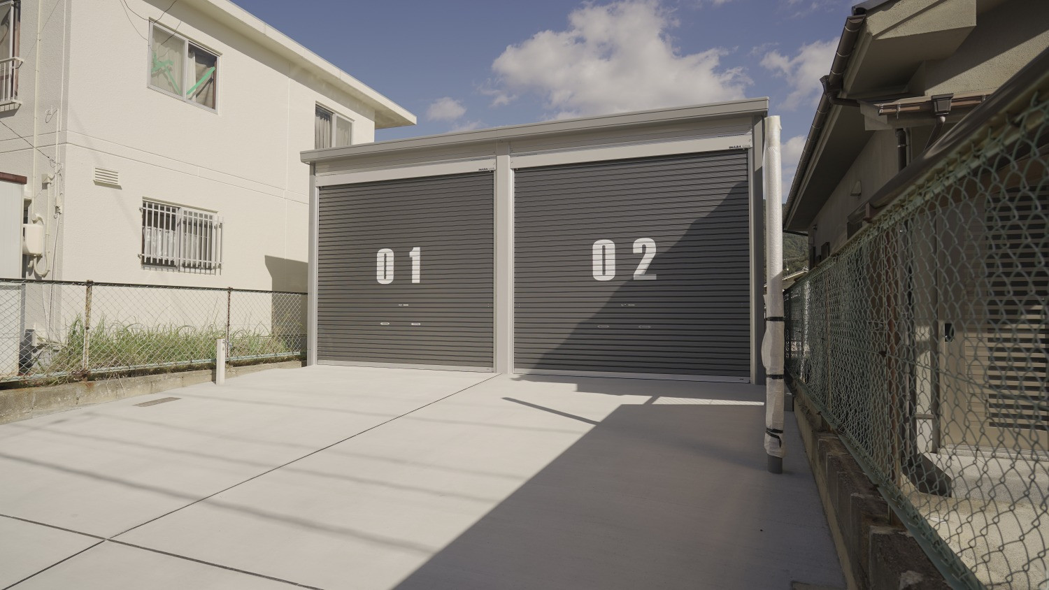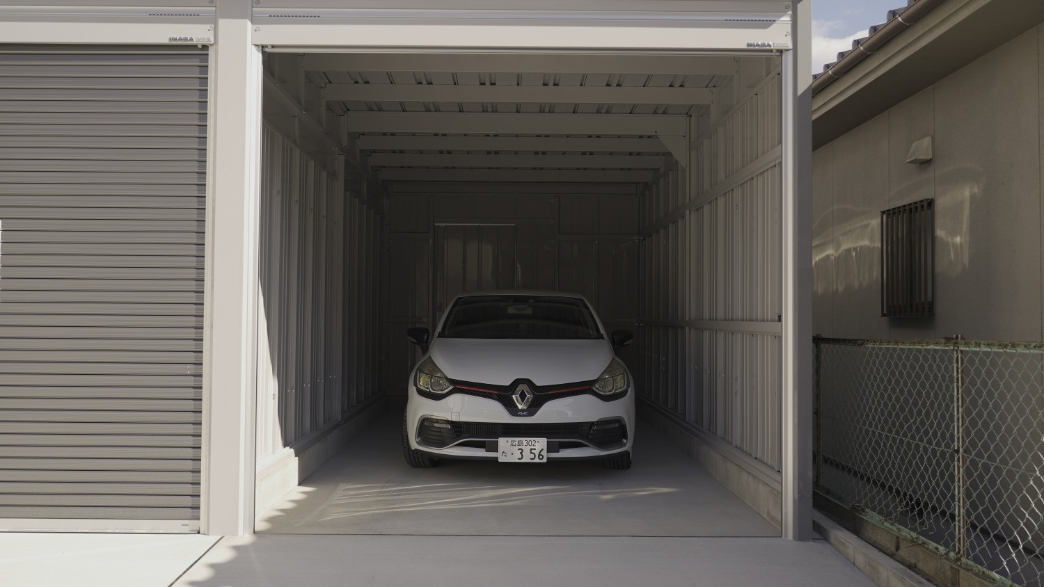 間口3,130mm×奥行6,275mm(開口間口2,850mm×開口高2,630mm)のシャッターガレージに、シャッター前面専用駐車場とガレージ裏の専用物置が1セットとなった物件。