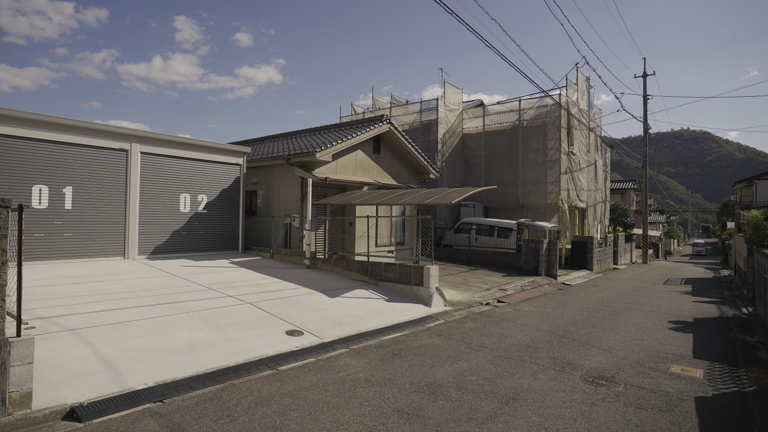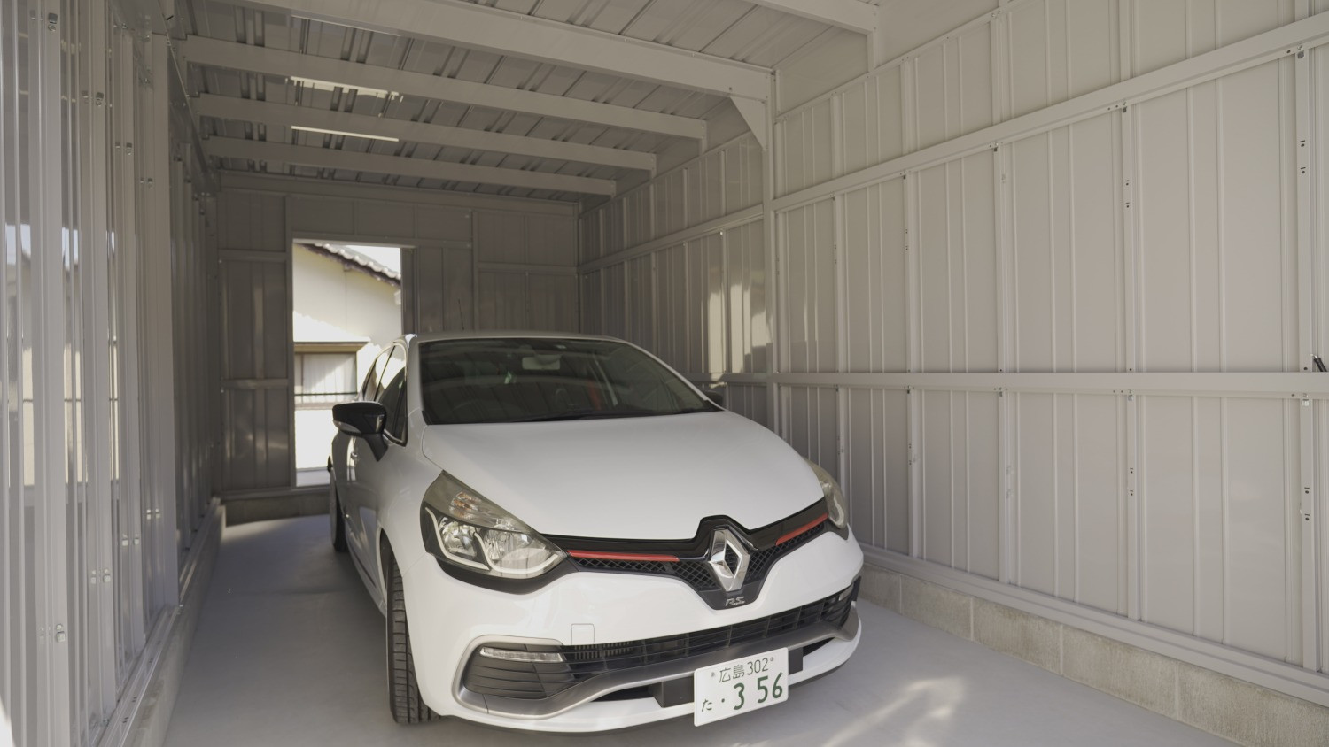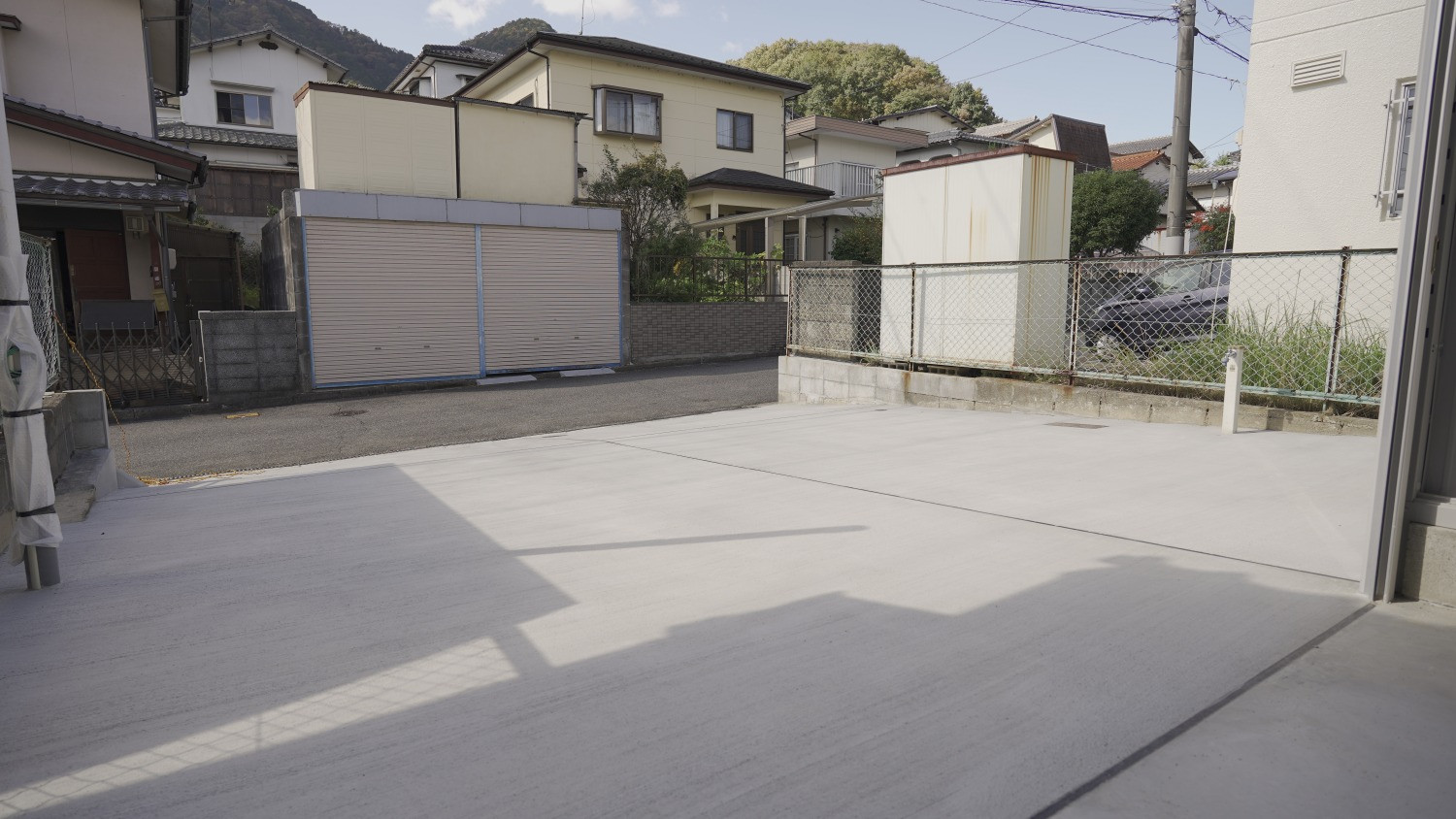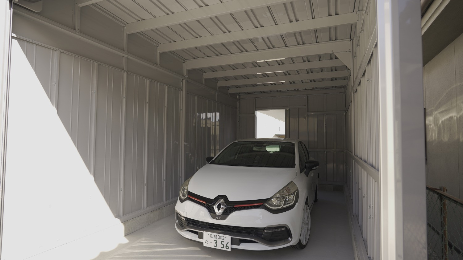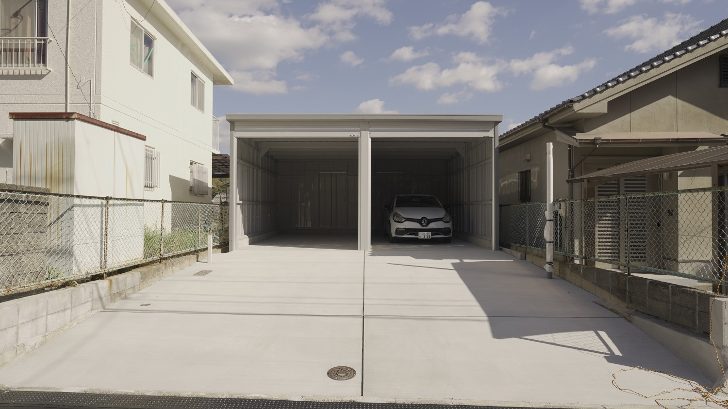 間口3,130mm×奥行6,275mm(開口間口2,850mm×開口高2,630mm)のシャッターガレージに、シャッター前面専用駐車場とガレージ裏の専用物置が1セットとなった物件。