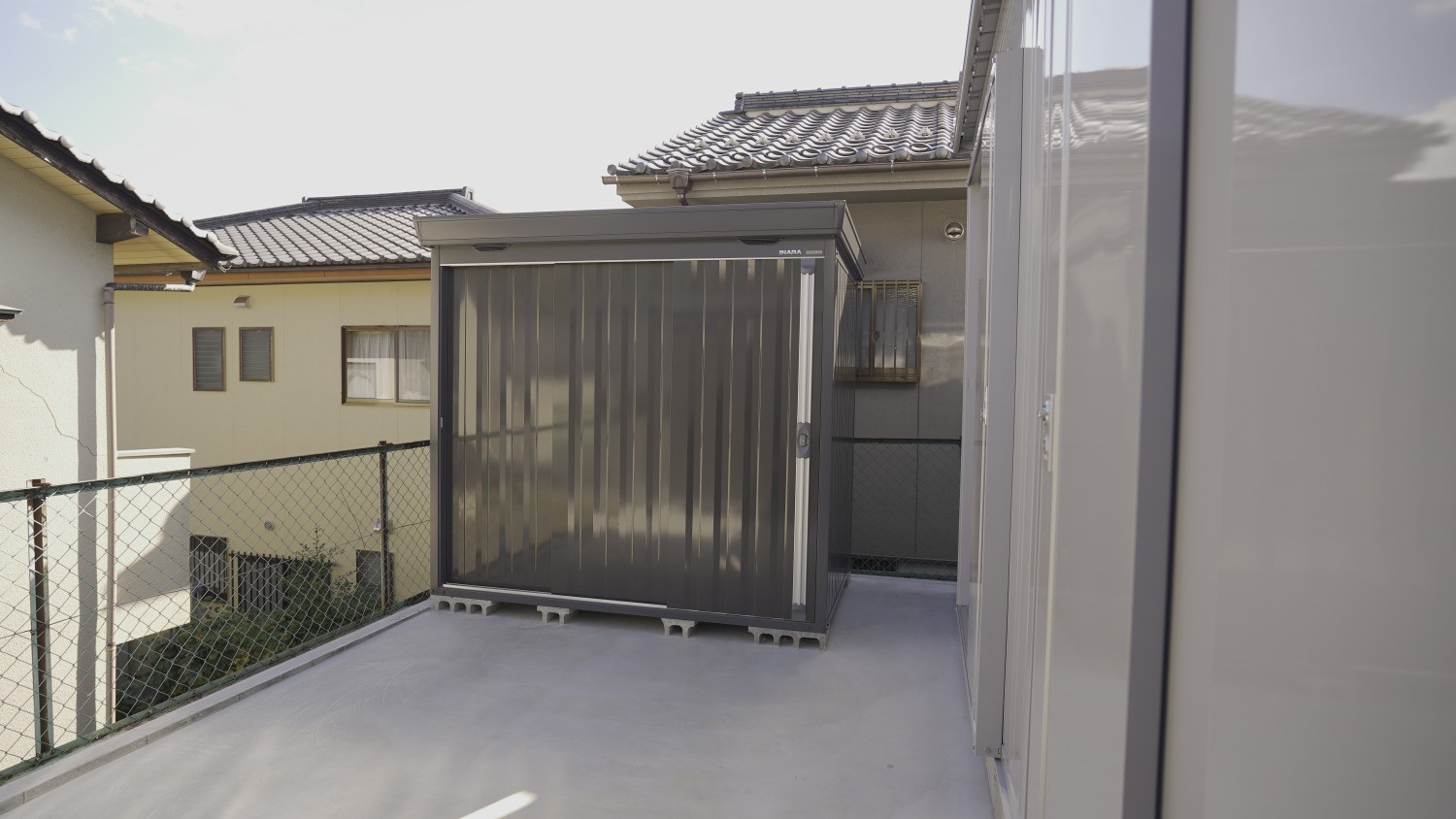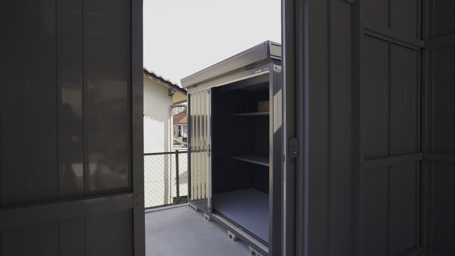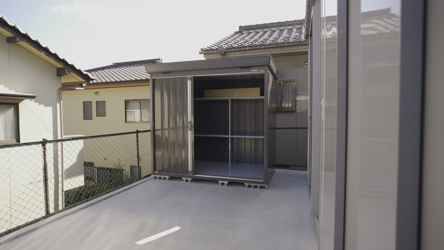 物置へのアクセスはガレージ奥の引戸から。ガレージ内に置いておきたくない嵩張るタイヤやホイール、取り外したマフラー等のパーツ類、洗車道具やフロアジャッキなどを纏めて収納し、ガレージ内を広々と使えます。