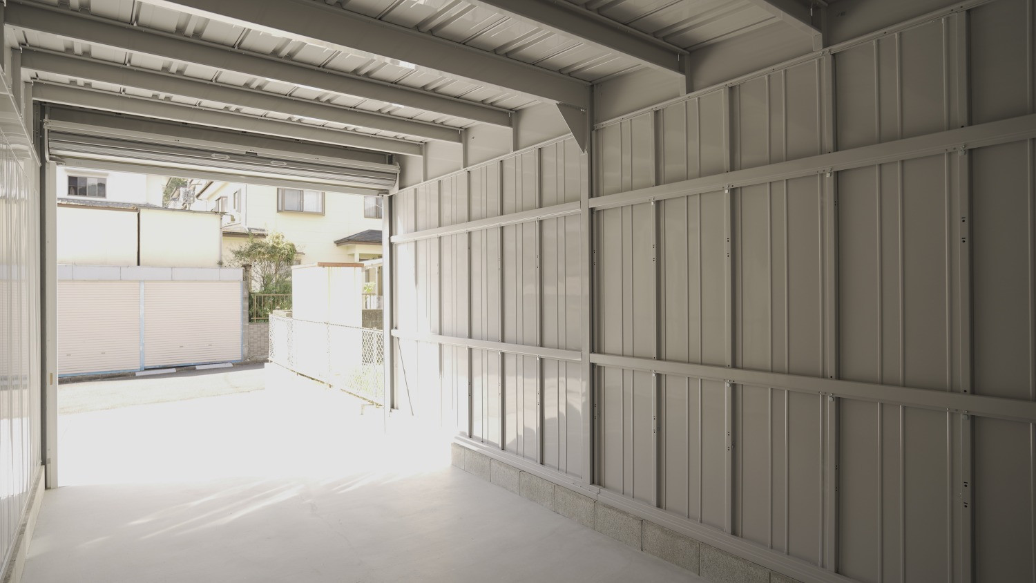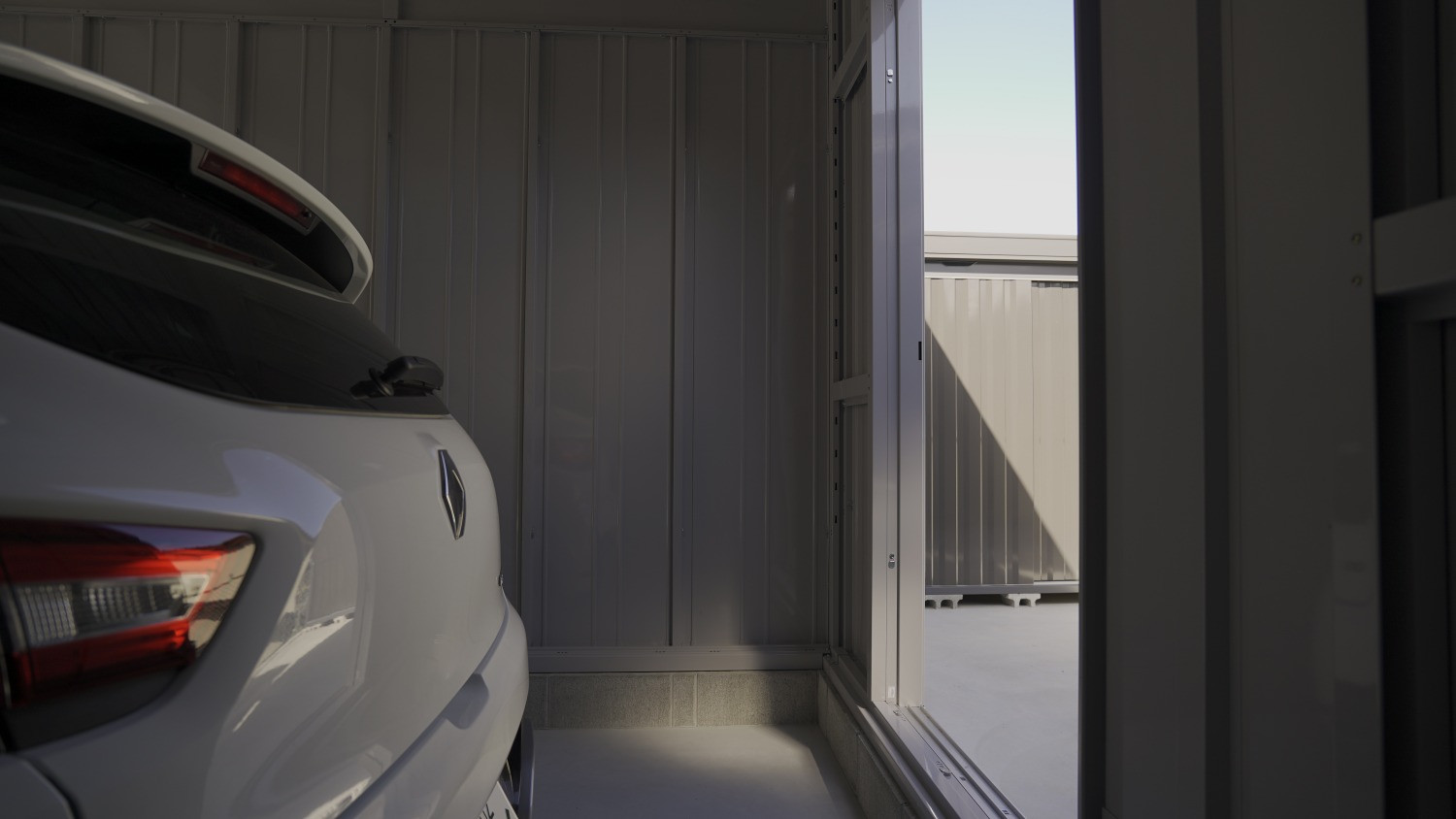 間口3,130mm×奥行6,275mm(開口間口2,850mm×開口高2,630mm)のシャッターガレージに、シャッター前面専用駐車場とガレージ裏の専用物置が1セットとなった物件。