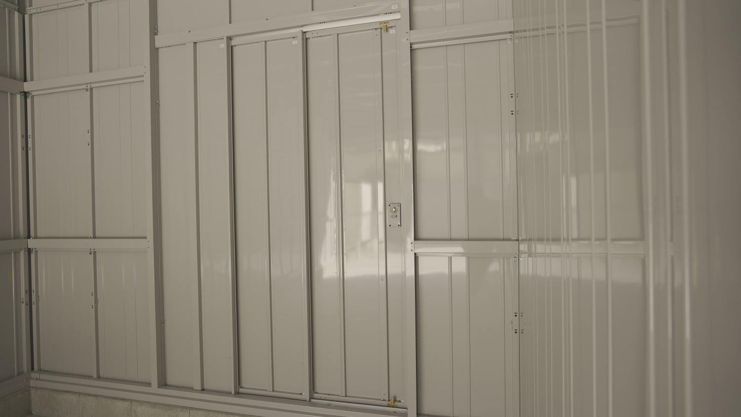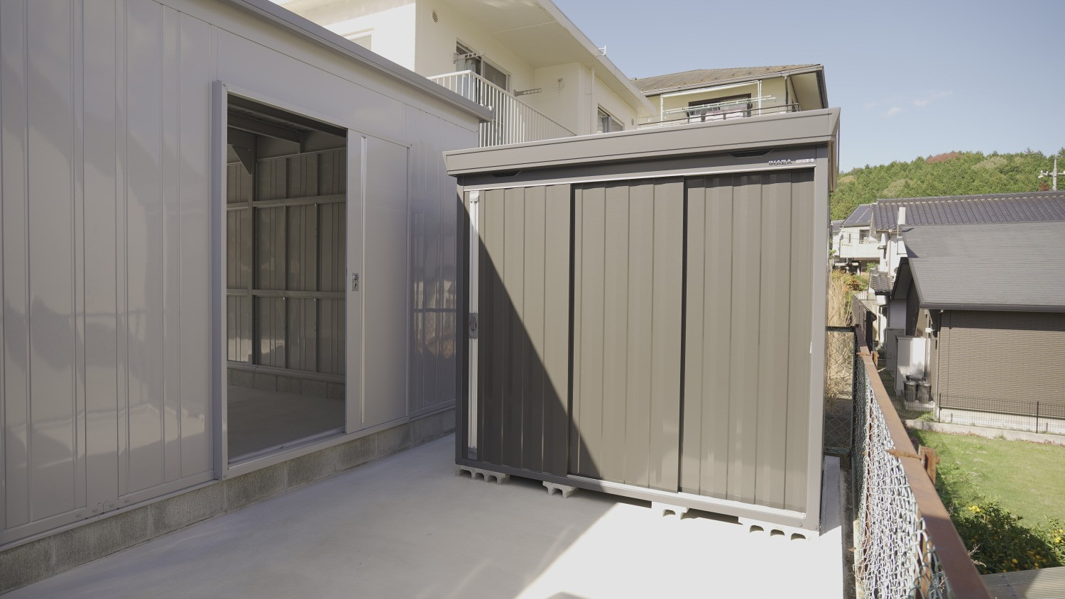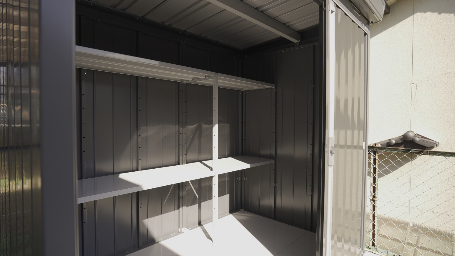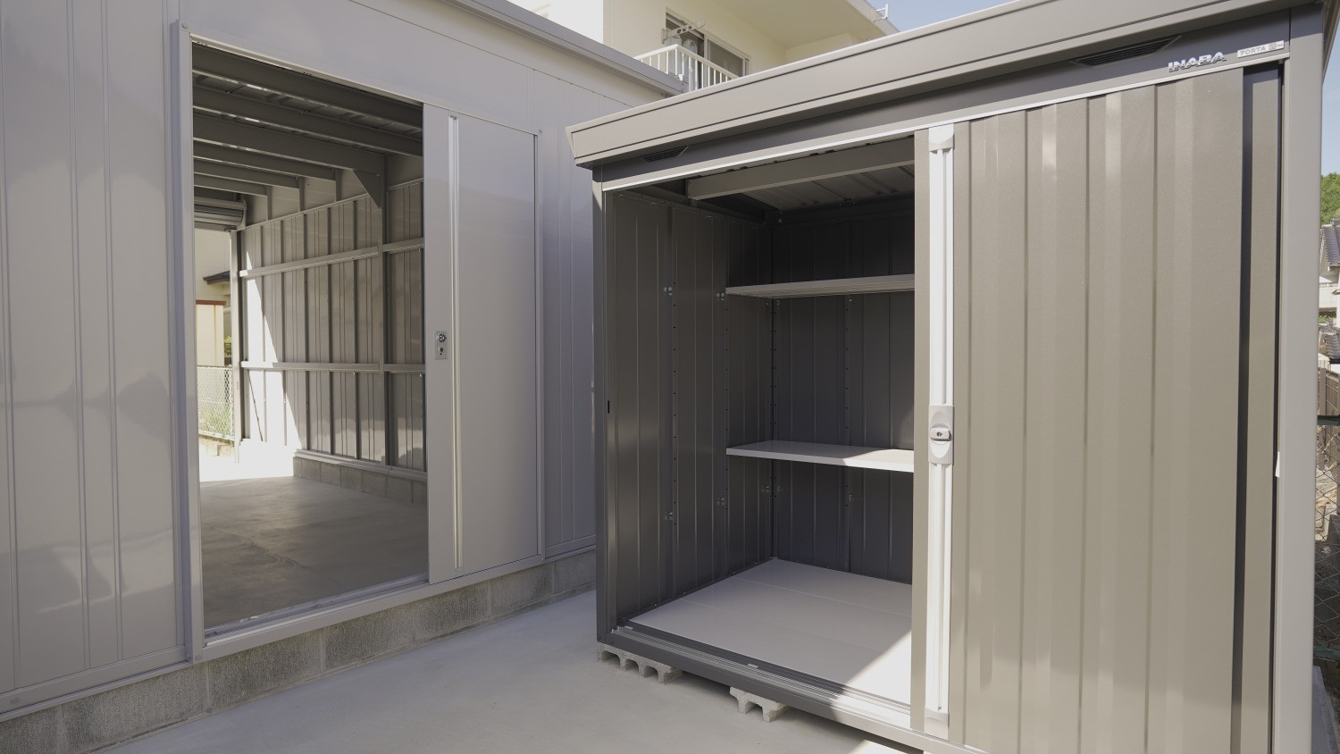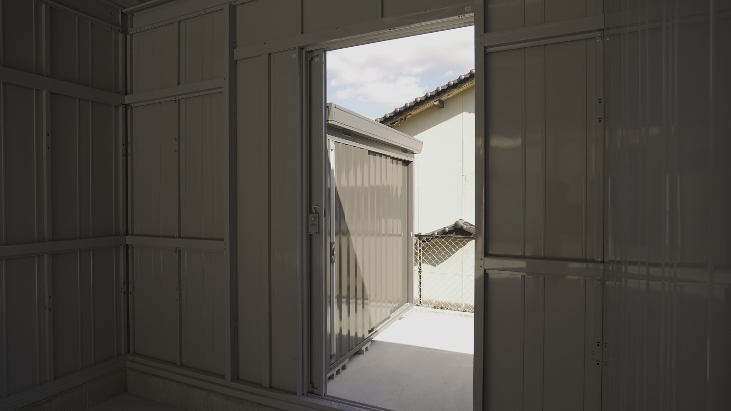 物置へのアクセスはガレージ奥の引戸から。大きさはガレージの約12帖に対して物置は約1.8帖と比べるべくもありませんが、収納用途を使い分けできる点がポイントでして意外と重宝致します。