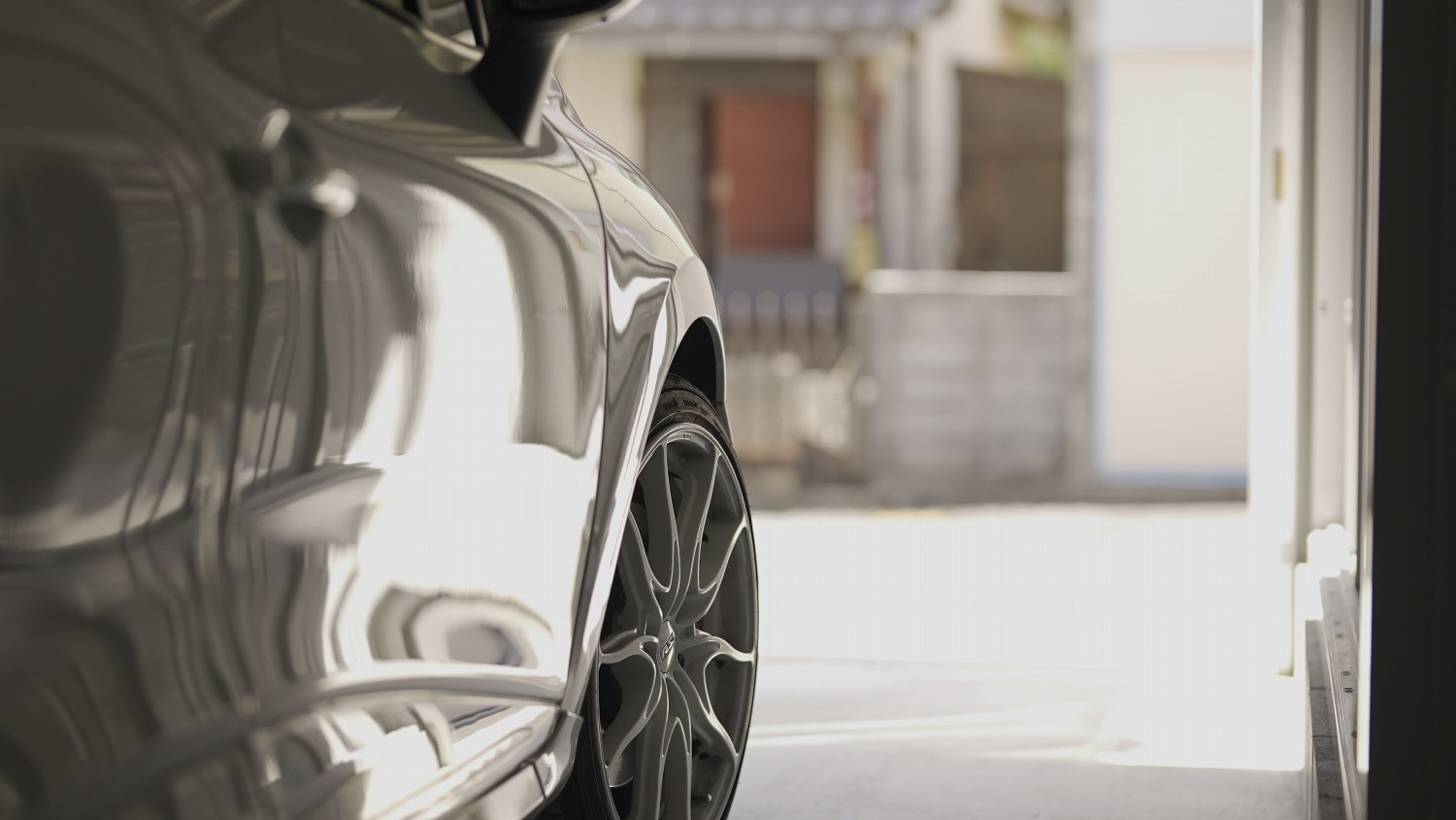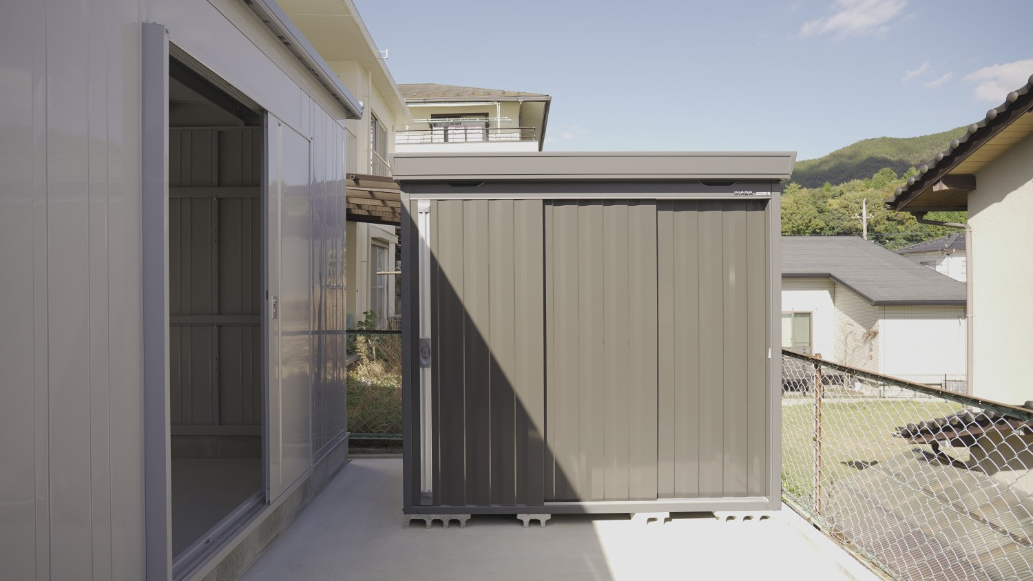 物置へのアクセスはガレージ奥の引戸から。大きさはガレージの約12帖に対して物置は約1.8帖と比べるべくもありませんが、収納用途を使い分けできる点がポイントでして意外と重宝致します。