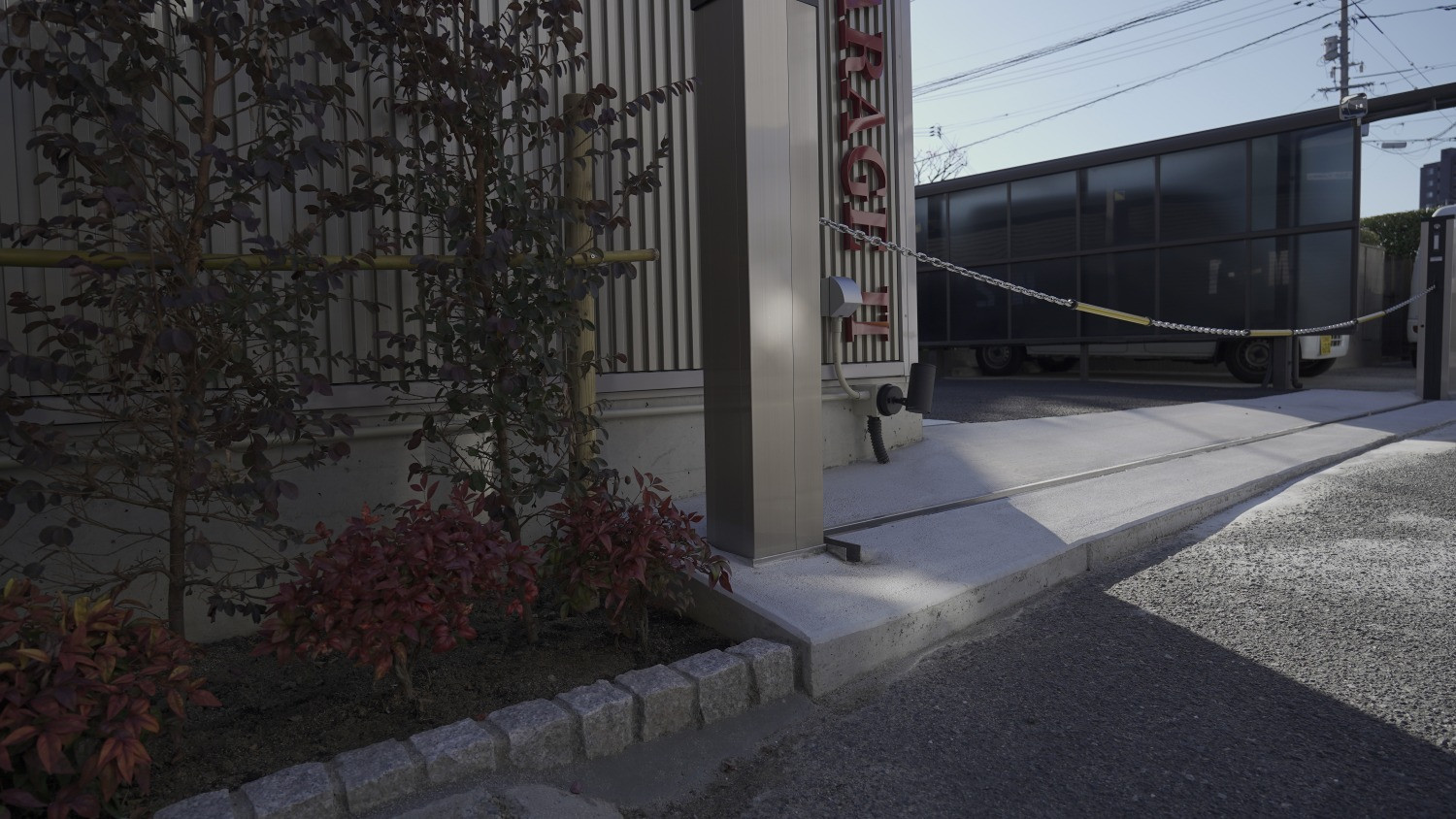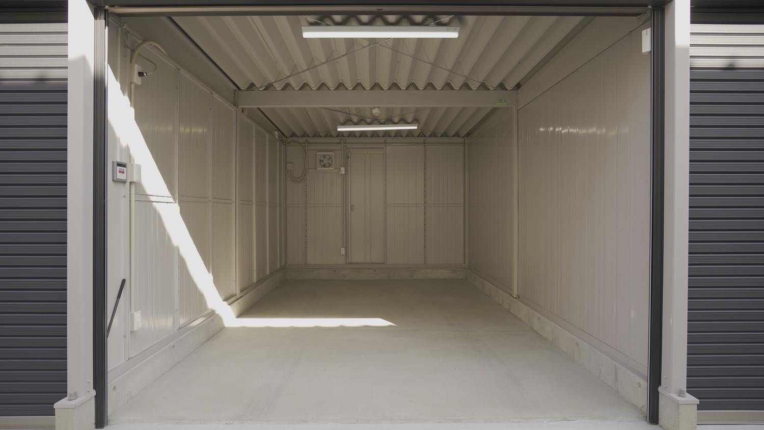 仕様は全戸電動シャッターに照明・コンセント・換気扇・ALSOKセキュリティを標準装備付き。敷地入口には電動チェーンゲートを備え、防犯カメラもALSOK製。