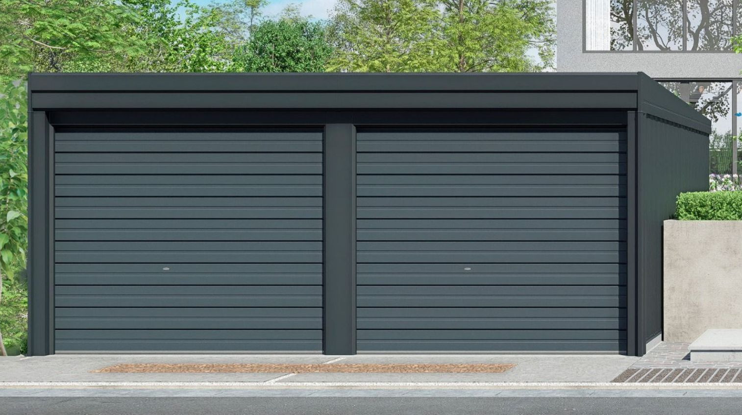 ブラック基調のスタイリッシュなガレージと専用駐車場がセットになったシャッターガレージ。