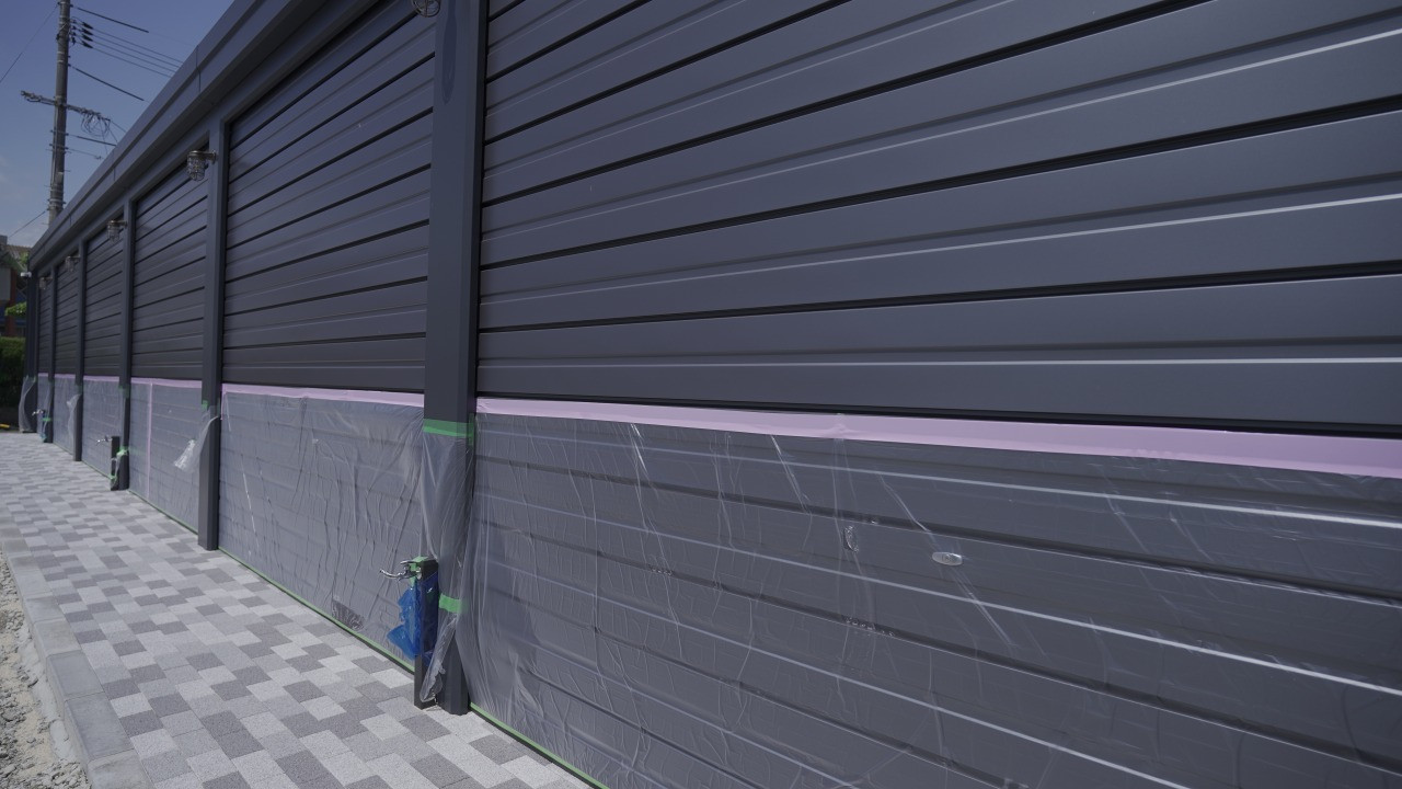 ブラック基調のスタイリッシュなガレージと専用駐車場がセットになったシャッターガレージ。