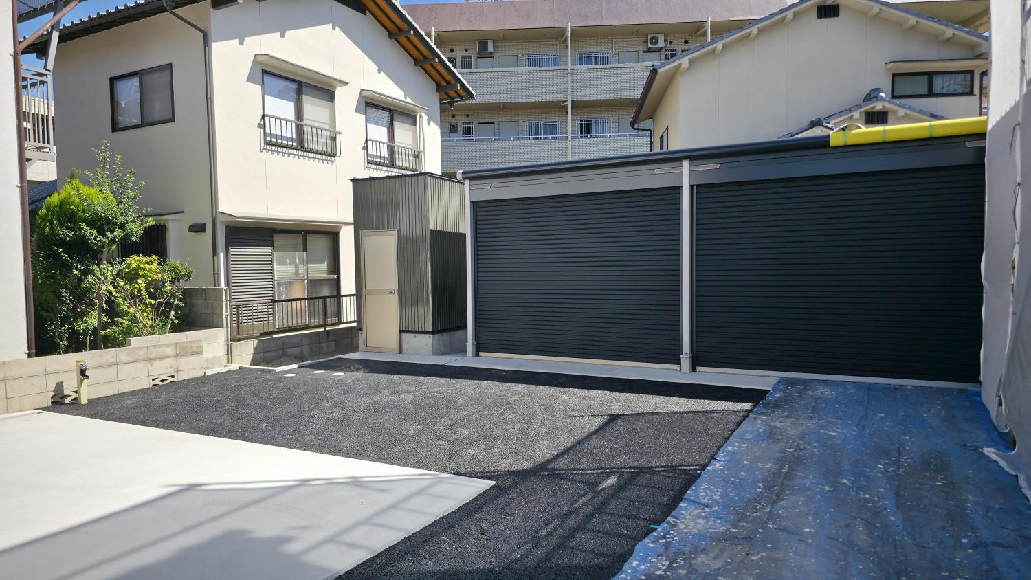 M-typeとL-typeの違いは広さと設置方向のみ。間口サイズは同じですが、M-typeは奥行が1m程ショートしており、前面通路も4.5〜4.7m程度なので全長の長い車両は取り回しを十分にご確認頂いた方が宜しいでしょう。 一方、シャッター前方のお宅は当敷地に面した窓が無いに等しくプライバシー面ではL-typeよりも有利です。