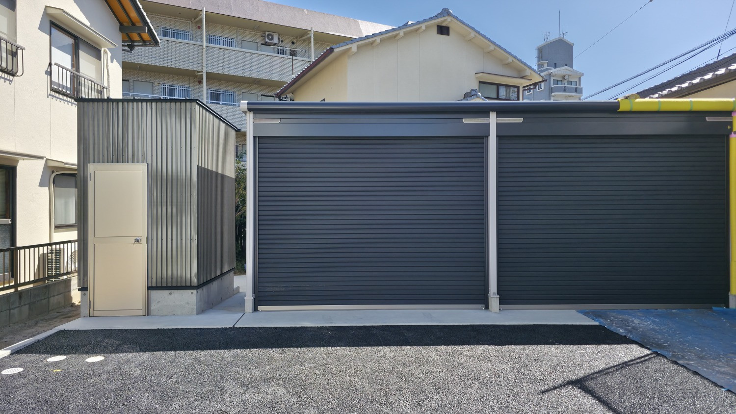 M-type(間口3.26m×奥行5.22m)×8戸、L-type(間口3.26m×奥行6.27m)×2戸 計10戸で構成される中規模ガレージタウンが賃貸シャッターガレージ空白地帯である安佐南区内平地に初登場(当社調べ)。