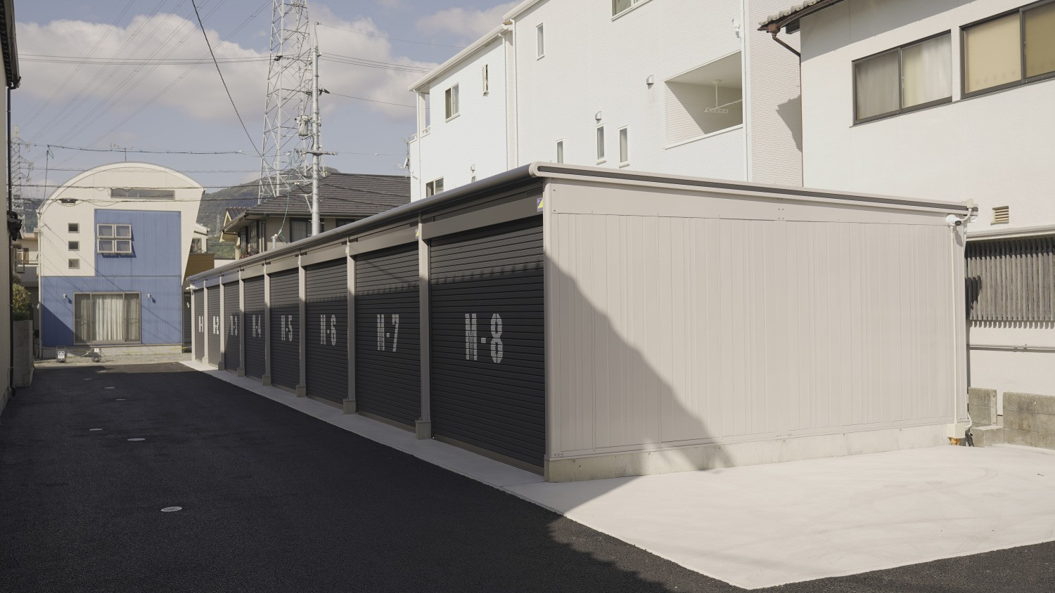 M-type(間口3.26m×奥行5.22m)×8戸、L-type(間口3.26m×奥行6.27m)×2戸 計10戸で構成される中規模ガレージタウンが賃貸シャッターガレージ空白地帯である安佐南区内平地に初登場(当社調べ)。